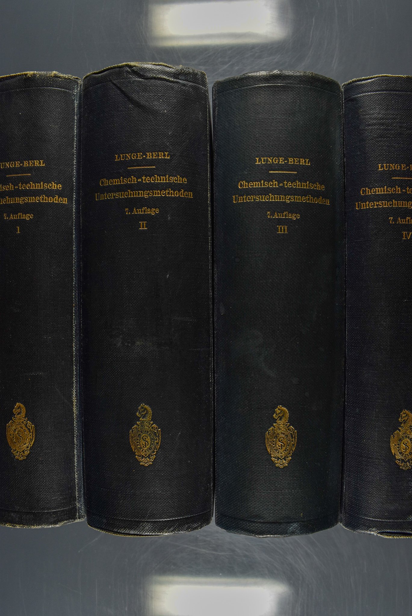 Lunge-Berl: Chemisch-technische Untersuchungsmethoden. Siebente, vollständig umgearbeitete und vermehrte Auflage. 4 Bände. Berlin, Springer, 1921-24. XXXII, 1099 S. (2 Bll.) mit 291 in den Text gedruckten Figuren und einem Bildnis – XLIV, 1411 S. (2 Bll.) mir 313 in den Text gedruckten Figuren – XXXI, 1362 S. (1 Bl.) mit 235 in den Text gedruckten Figuren – XXV, 1139 S.(1 Bl.) mit 125 in den Text gedruckten Figuren. Original-Leinenband mit goldgeprägtem Rückentitel. Innengelenk des zweiten Band angeplatzt. Sehr sauber und gut erhalten.