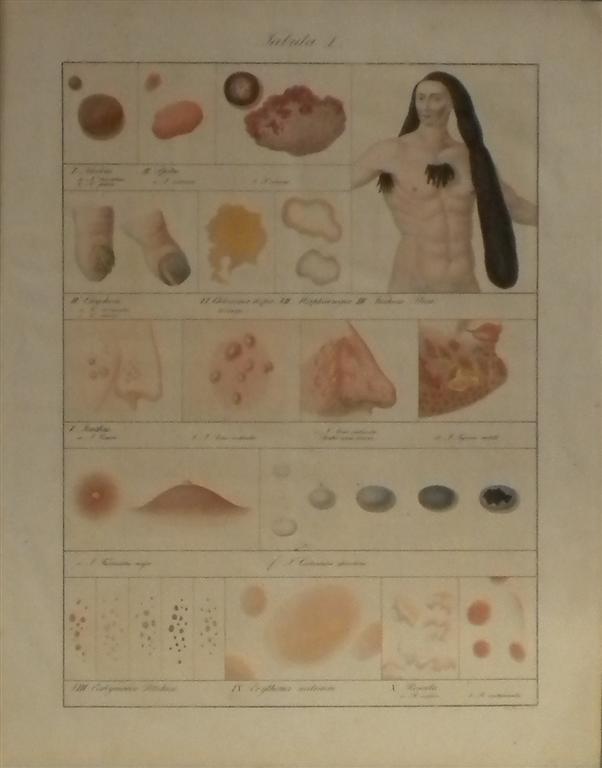 Struve, Ludwig August: Synopsis morborum cutaneorum secundum classes, genera, species et varietates. – Übersicht der Hautkrankheiten nach ihren Classen, Gattungen, Arten und Varietäten. Berlin, G. Reimer, 1829. Folio. 4 kolorierte Kupfertafeln, XII, 107 S. Späterer Halbleinenband (bestossen und berieben). Recke-Napiersky IV, 329; Hirsch/H. V, 464; ADB XXXVI, 691. – Nach Studium und Promotion in Kiel, ärztlicher Tätigkeit in Elmshorn, folgte Ludwig August Struve einem Ruf als Prof. der medizin. Klinik nach Dorpat. Struwe unterscheidet „in denen weder die Structur, noch die Farbe der Haut sichtbar verändert erscheint“ und Krankheiten „welche sich durch Veränderung entweder der Structur, oder der Farbe, oder beider zugleich in der Haut darstellen“. Sein Werk „zeichnet sich im übrigen durch eine gute historische Einleitung, ein zuverlässiges Sachregister und gute Kolorierung der Tafeln aus“ (Fick: Geschichte der Dermatologie…, S. 222). – Text durchgehend braunfleckig, leicht wasserrandig, Tafeln sauber und nahezu fleckenfrei, Innengelenke verstärkt.