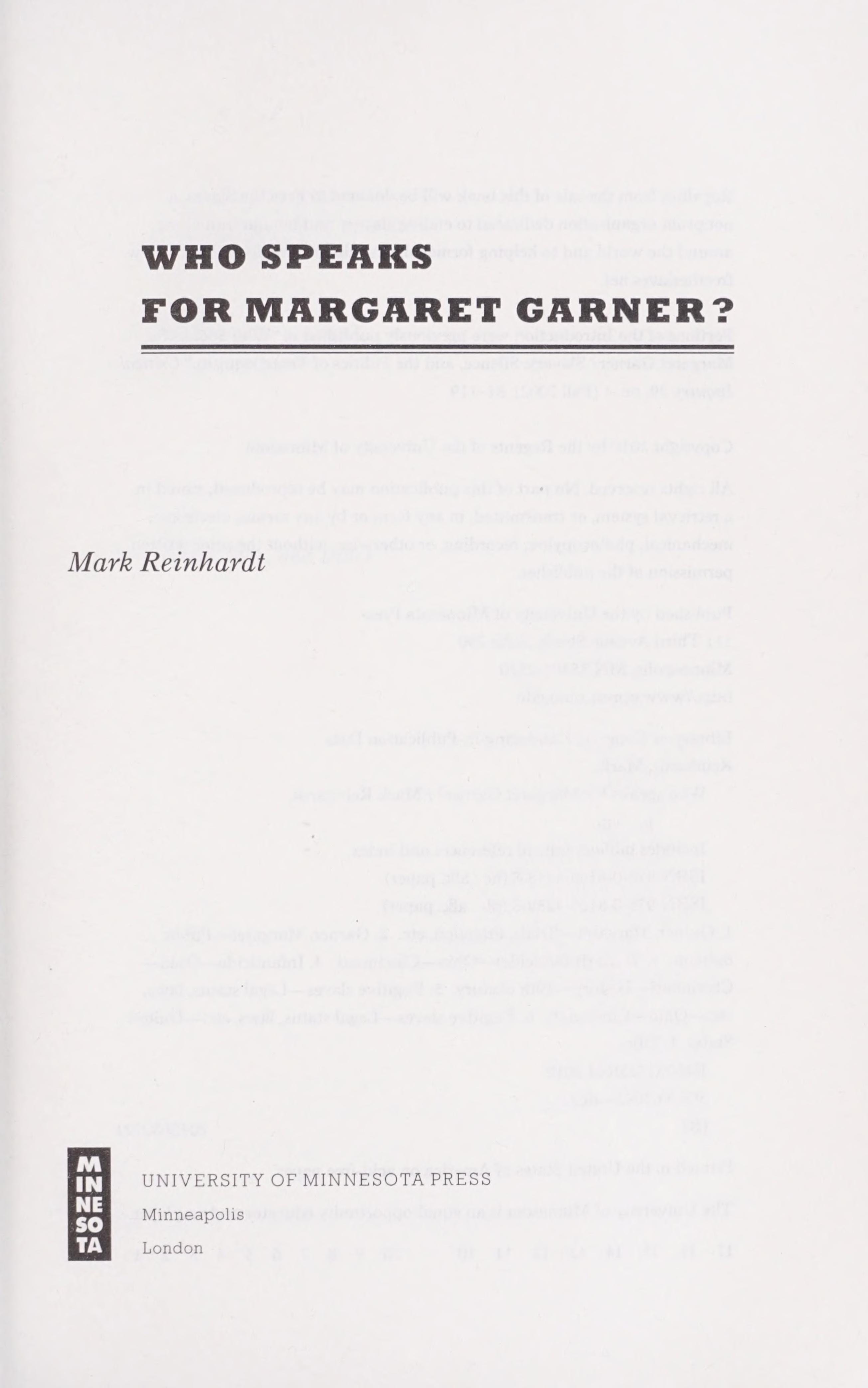 Reinhardt, Mark: Who Speaks for Margaret Garner?. 1st ed. Univ Of Minnesota Press, 2010. 15 x 23 cm. 320 pages. Paperback. Versand aus Deutschland / We dispatch from Germany via Air Mail. Einband bestoßen, daher Mängelexemplar gestempelt, sonst sehr guter Zustand. Imperfect copy due to slightly bumped cover, apart from this in very good condition. Stamped.
