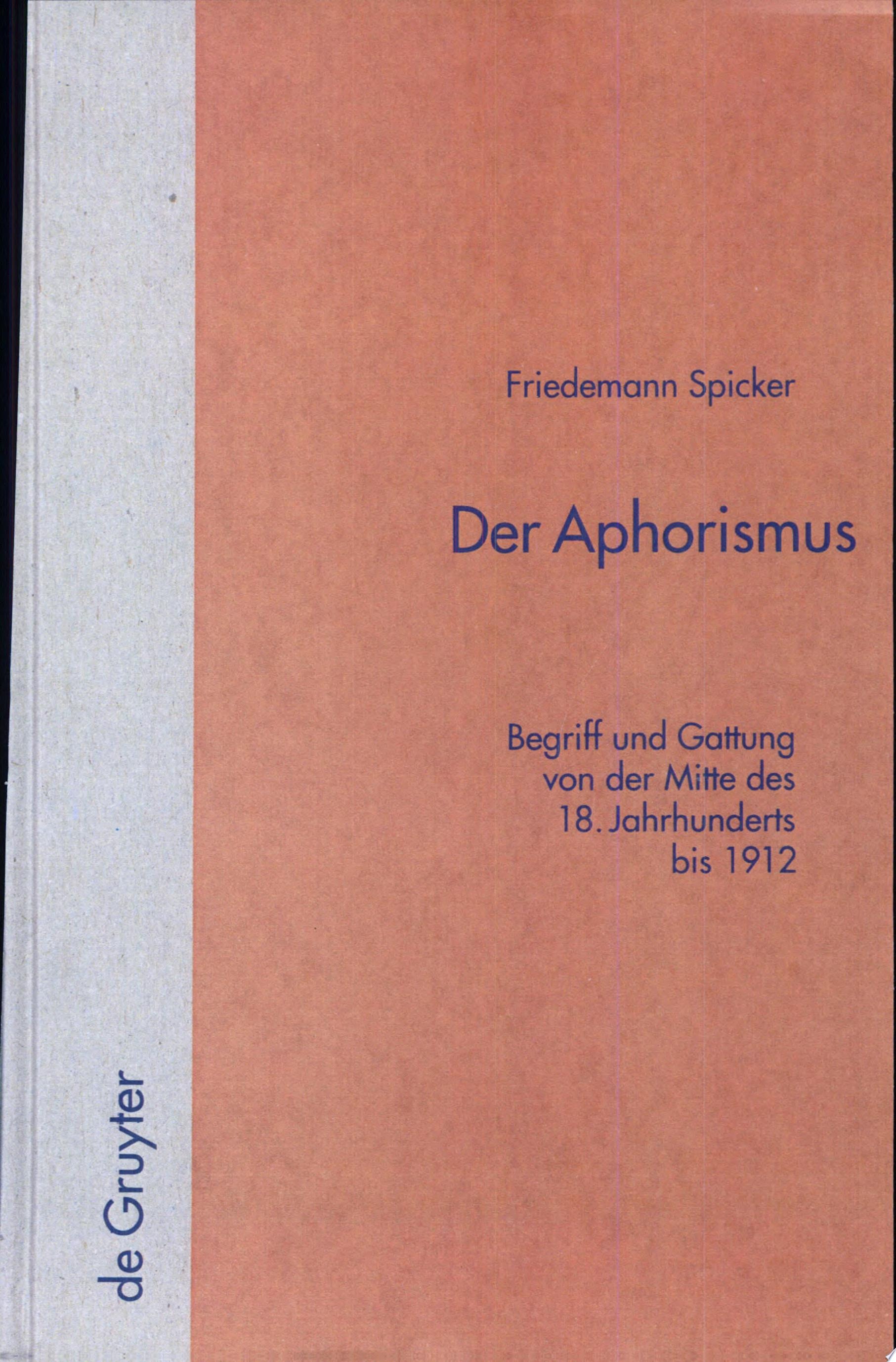 Spicker, Friedemann: Der Aphorismus Begriff und Gattung von der Mitte des 18. Jahrhunderts bis 1912. Reprint 2012 ed. Walter de Gruyter, 1997. 16 x 23 cm. 484 S. Hardcover. Versand aus Deutschland / We dispatch from Germany via Air Mail. Einband bestoßen, daher Mängelexemplar gestempelt, sonst sehr guter Zustand. Imperfect copy due to slightly bumped cover, apart from this in very good condition. Stamped.
