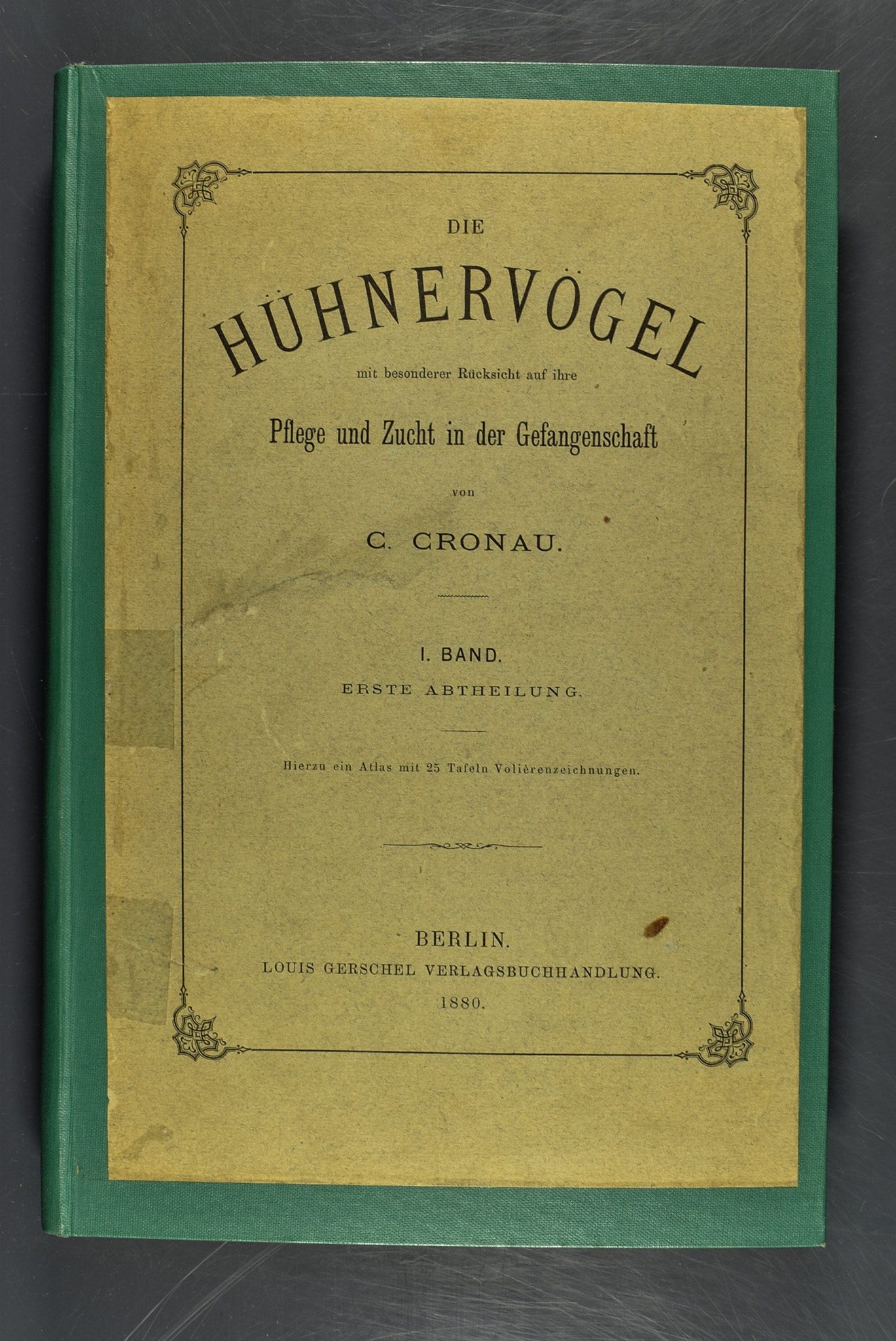 Cronau, Carl: Die Hühnervögel mit besonderer Rücksicht auf ihre Pflege und Zucht in der Gefangenschaft, Text- und Tafelband. Bd. I. Abt. 1 (= alles Erschienene): Eingewöhnung, Pflege und Schutz in der Gefangenschaft. Berlin, L. Gerschel, 1880. Text-Bd.: 8 lith. Taf., (2 Bl.), III, 264 S. Neuer Leinenband mit aufgezogener OBr. – Atlas-Bd.: Quer- Gr.-Folio. 25 lith. Taf. OHlwd. (fleckig, bestoßen, Bindung beschädigt). Krieg, MNE I, 161. – I. Beschaffung und Erhaltung: Allgemeines. Bezugsquellen und Preise. Versendung und Transport. Ernährung und Pflege. Zoologische Gärten. II. Vogelhäuser. – Der Atlas zeigt Details der Einrichtung und Volièren u.a. aus den zoolog. Gärten in Antwerpen, Basel, Berlin, Brüssel, Düsseldorf, Hamburg, Köln, London, Paris und Rotterdam.