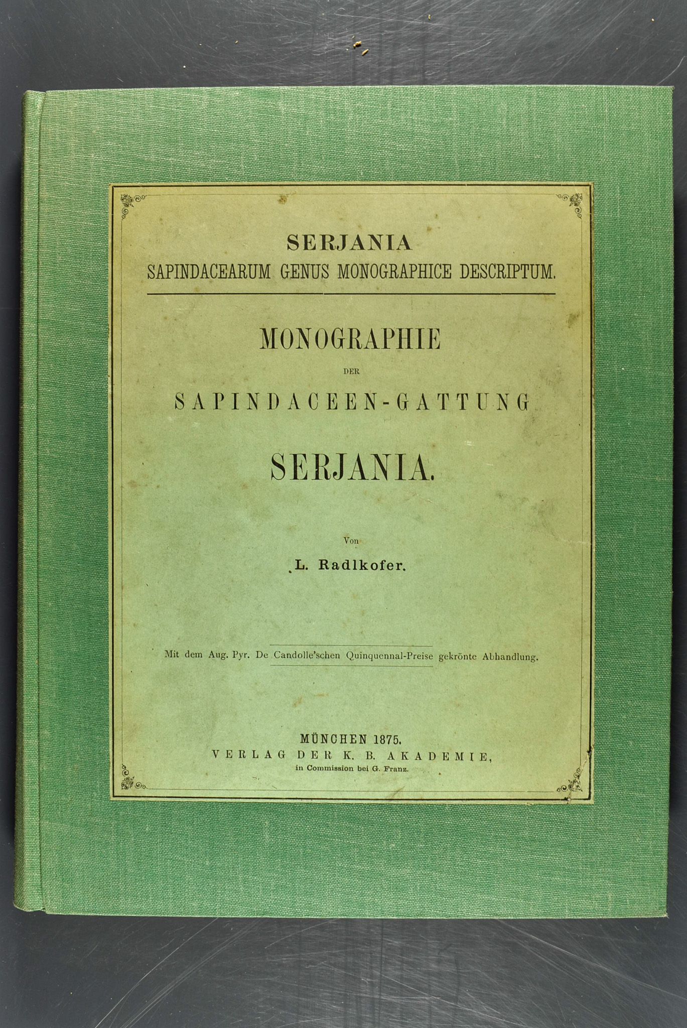 Radlkofer, Ludwig: Serjania Sapindacearum genus monographice descriptum. Monographie der Sapindaceen-Gattung Serjania. München, K. B. Akademie, 1875. 4°. XVIII, 392 S. Neuer Lwd.-Bd. mit aufgezogener OBr. ’Mit dem Aug. Pyr. De Candolle’schen Quinquennal-Preise gekrönte Abhandlung.’ – Junk, Bibl. Bot. Suppl. 11386. – L. v. Radlkofer (1829-1927) war seit 1891 Direktor des Botanischen Museums und des Staatsherbariums in München. – Anfangs etwas gebräunt bzw. braunfleckig.
