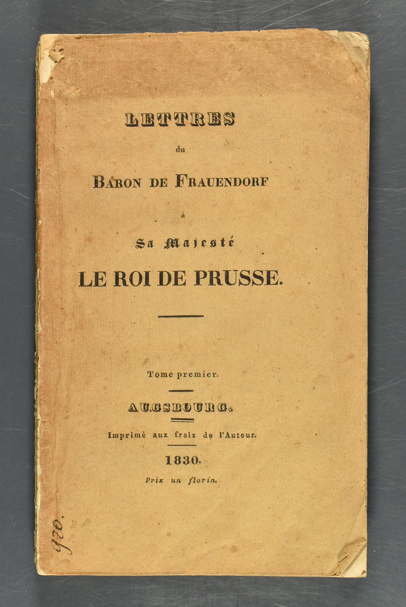 Frauendorf, Baron von: Briefe des Baron von Frauendorf an Seine Majestät den König von Preussen. Erster Theil (alles erschienene). Augsburg, gedruckt auf Kosten des Verfassers, 1830. 205 S. (1 Bl. Errata). Unbeschnittene Original-Broschur (gebräunt, angerändert, Rücken aufgelöst). Textblock bei S. 48/49 gebrochen. Titel und Vortitel leicht bis mäßig fleckig und wasserrandig. Seiten stellenweise geringfügig fleckig und wasserrandig. Zweisprachige (franz.-dt.) Ausgabe. MNE II/1, 236; Humpert 7998(and. Ausg.) – Enthält Briefe des geb. Franzosen Frauendorf, der in Preußen Gutsbesitzer war u. sich über die Auflagen u. Schikanen seitens der preuß. Behörden beklagt; „in Ihren Staaten hat des Fiskus die Anmassung, Alles zu verschlingen, das Wohl der Privatleute achtete er für nichts…Das Tribunal, die Regierung…Alles hatte sich verschworen, mir eine Unternehmung verderblich zu machen, die mir Gewinn bringen konnte.“