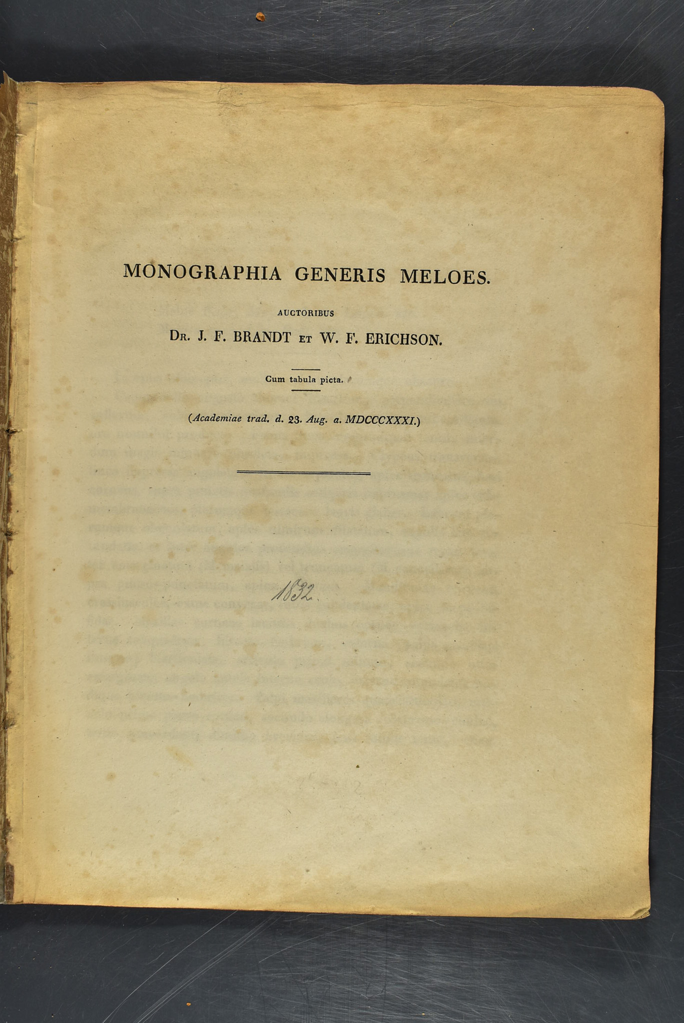 Brandt, Johann Friedrich; Wilhelm Ferdinand Erichson: Monographia generis meloes. o. O., o. Dr., 1831. 1 kolor. Bildtafel, (1 Bl.), S. 103-142. Interims-Broschur (mit Randläsuren). Umschlag mit Buchbinderklebeband an vorderer Innenfalz fixiert. Tafel papierbedingt gebräunt, sonst ein innen sehr sauberes und gut erhaltenes Exemplar. Sehr selten.