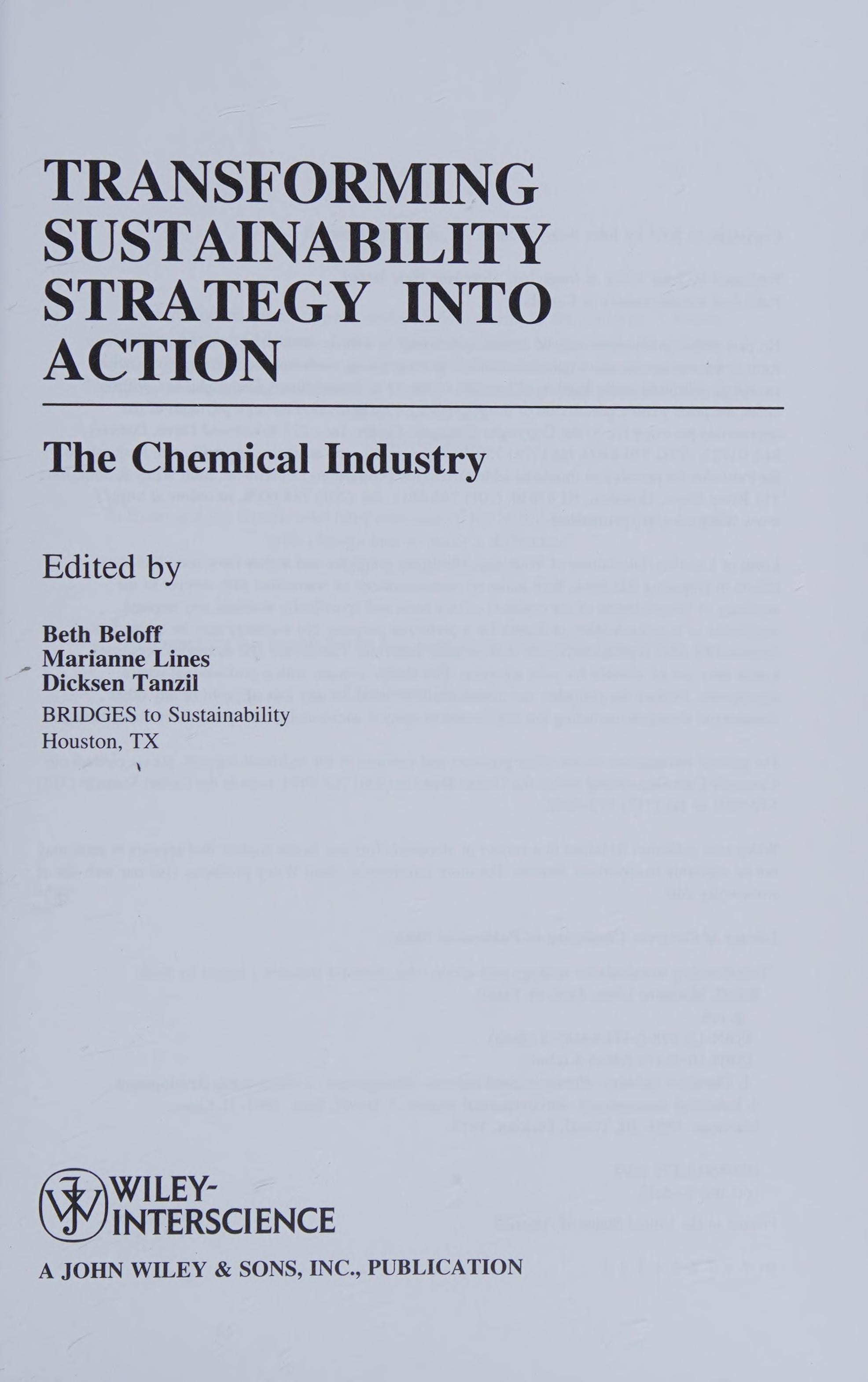 Beloff, Beth Transforming Sustainability Strategy into Action: The Chemical Industry. 1st ed. Wiley-Interscience, 2005. 16 x 24 cm. 576 pages. Hardcover. Versand aus Deutschland / We dispatch from Germany via Air Mail. Einband bestoßen, daher Mängelexemplar gestempelt, sonst sehr guter Zustand. Imperfect copy due to slightly bumped cover, apart from this in very good condition. Stamped.