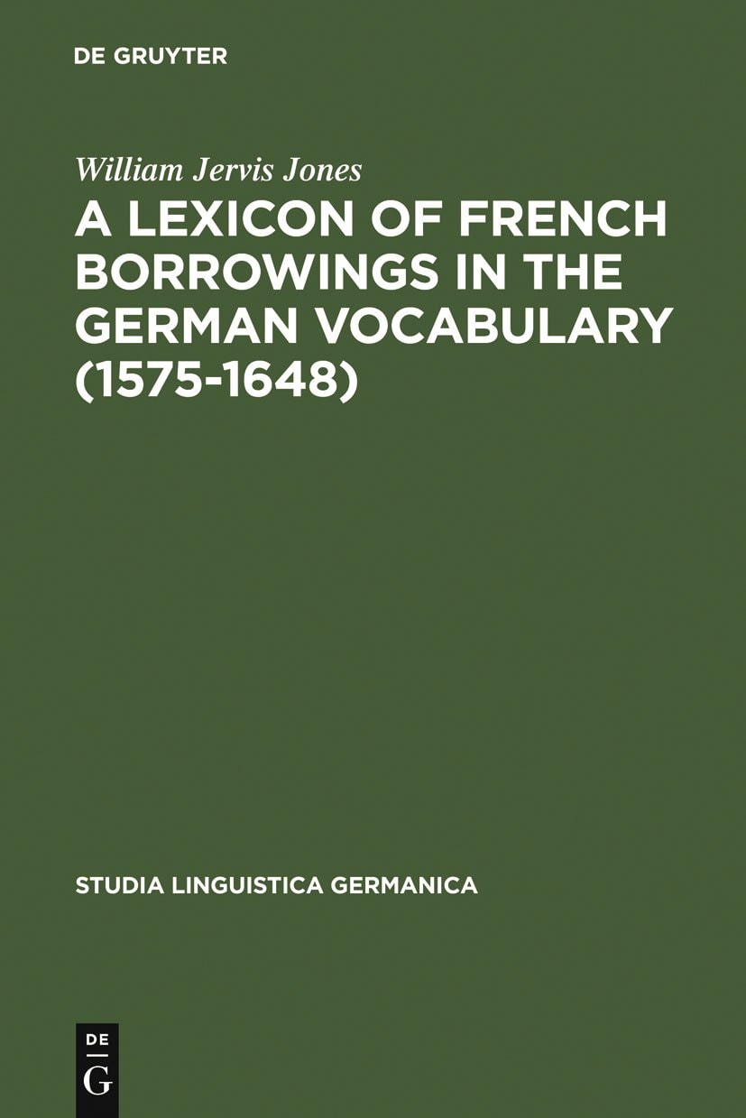 Jones, William Jervis: A Lexicon of French Borrowings in the German Vocabulary (1575-1648) (Studia Linguistica Germanica). Reprint 2012 ed. De Gruyter, 1976. 16 x 23 cm. 714 pages. Hardcover. Versand aus Deutschland / We dispatch from Germany via Air Mail. Einband bestoßen, daher Mängelexemplar gestempelt, sonst sehr guter Zustand. Imperfect copy due to slightly bumped cover, apart from this in very good condition. Stamped.