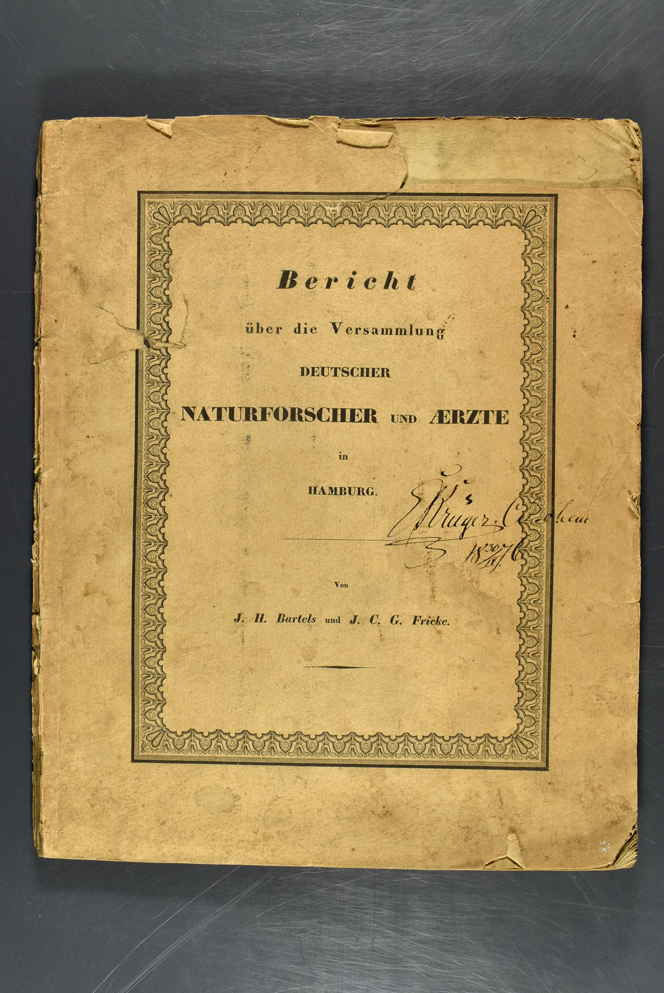 Bartels, Johann Heinrich; J. C. G. Fricke: Amtlicher Bericht über die Versammlung Deutscher Naturforscher und Aerzte in Hamburg im September 1830. Nebst einer lithographirten Sammlung eigenhändiger Namenszüge der Theilnehmer. Hamburg, Perthes & Besser, 1831. (1 Bl.), 71 S. (24 S. Sammlung der Namenszüge). Original-Broschur (angeschmutzt, Umschlag mit einem Eckauriss und zwei professionel hintelegten Einrissen). Mit Besitzvermerk von alter Hand auf dem vorderen Umschlagblatt und Stempel auf dem Titel.