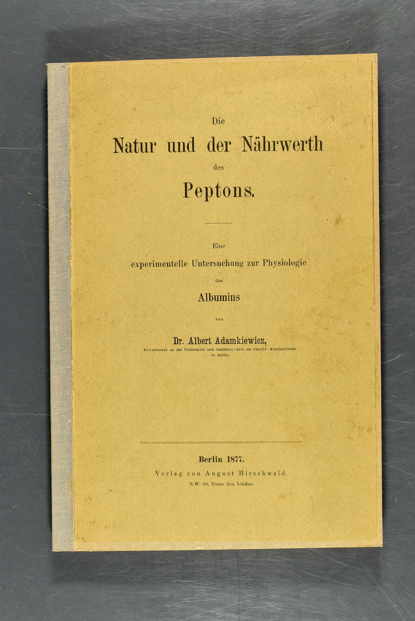 Adamkiewicz, Albert: Die Natur und der Nährwerth des Peptons. Eine experimentelle Untersuchung zur Physiologie des Albumins. Berlin, A. Hirschwald, 1877. (1 Bl.), 128 S. Spätere Steifbroschur mit aufgezogenem Original-Umschlag (geringfügig angeschmutzt). Stellenweise geringfügig fleckig oder mit Bleistiftmarkierungen, sonst in guter Erhaltung.