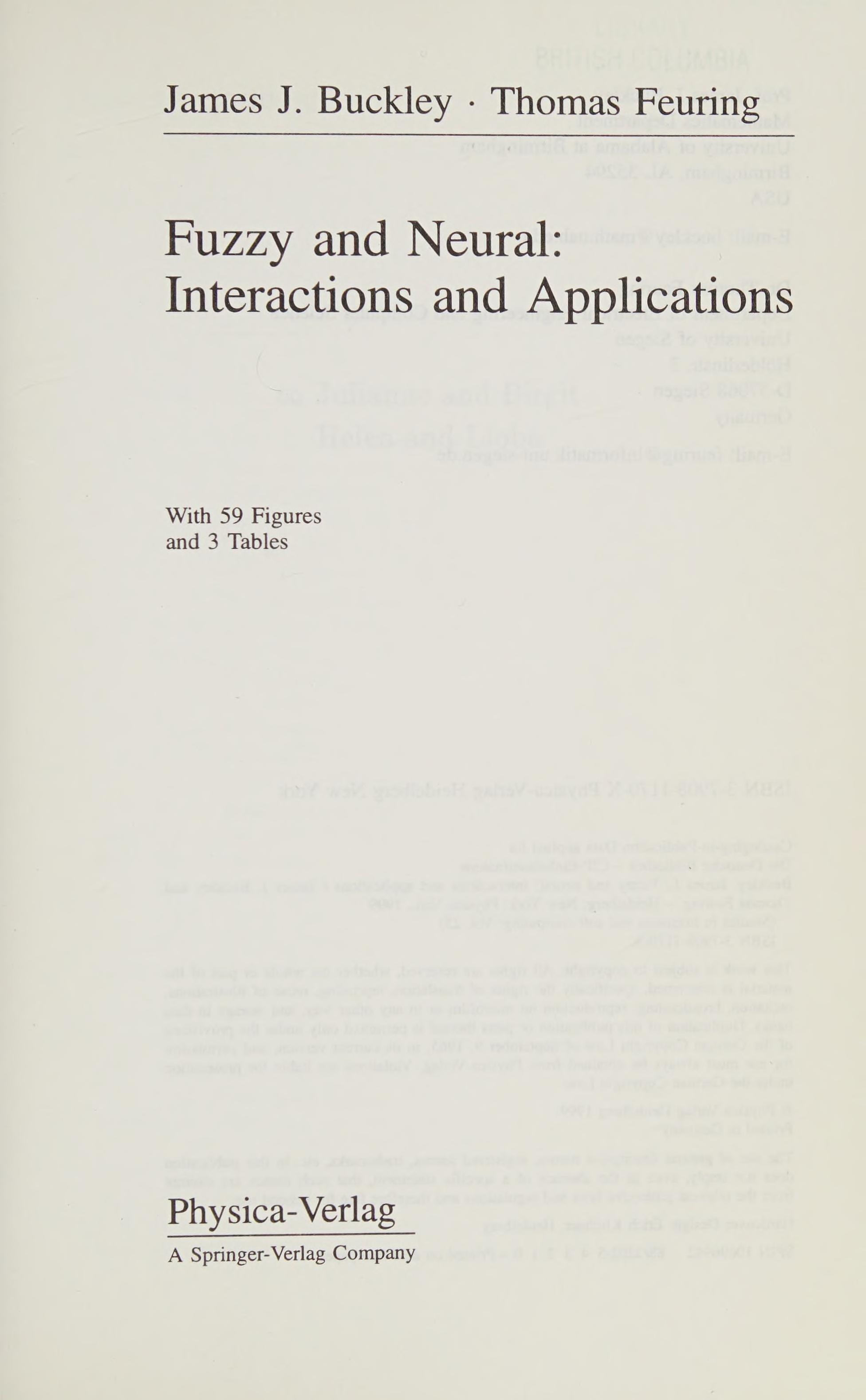 Buckley, James J./Feuring, Thomas: Fuzzy and Neural: Interactions and Applications (Studies in Fuzziness and Soft Computing, 25). 1999th ed. Physica, 1999. 16 x 23 cm. 176 pages. HC Versand aus Deutschland / We dispatch from Germany via Air Mail. Einband bestoßen, daher Mängelexemplar gestempelt, sonst sehr guter Zustand. Imperfect copy due to slightly bumped cover, apart from this in very good condition. Stamped.